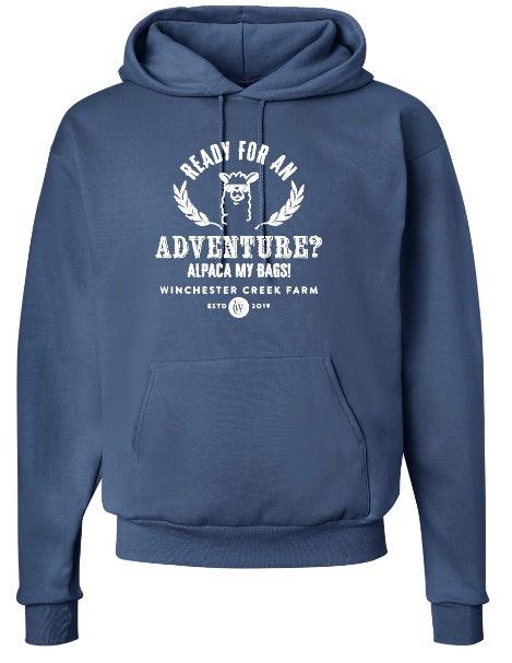 Ready for an adventure? Alpaca my bags! Bring this hilarious sweatshirt home. With an adorable quote and our farm's logo, this is the perfect gift for any alpaca enthusiast.