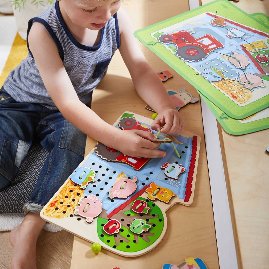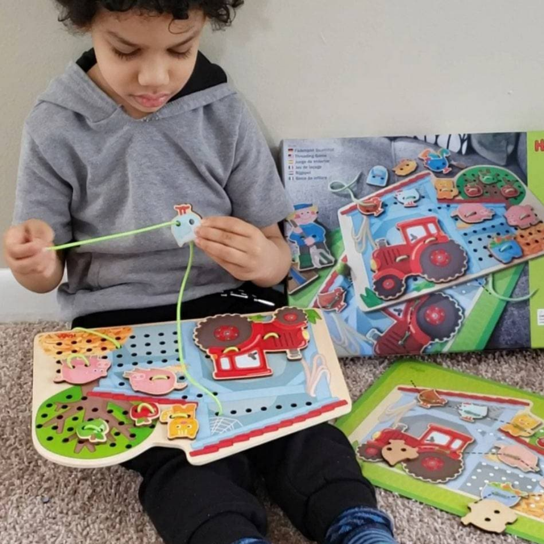 Threading fun for all farming fans! Your child can thread the tile onto the farm scene however they like, or match the template to create a scene. This wooden threading toy includes a 12.5" wide by 9" tall playboard with a barn and a tree and 117 holes for threading. The set also includes 18 threading tiles, including a tractor, a farmer, several animals and accessories that can be sewn onto the board. Designed for ages 3 and up, there are also two double-sided, tear-resistant template cards to show different ways to thread the accessories onto the toy. Threading toys teach fine motor skills and hand-eye coordination while also fostering imagination, creativity, and planning.