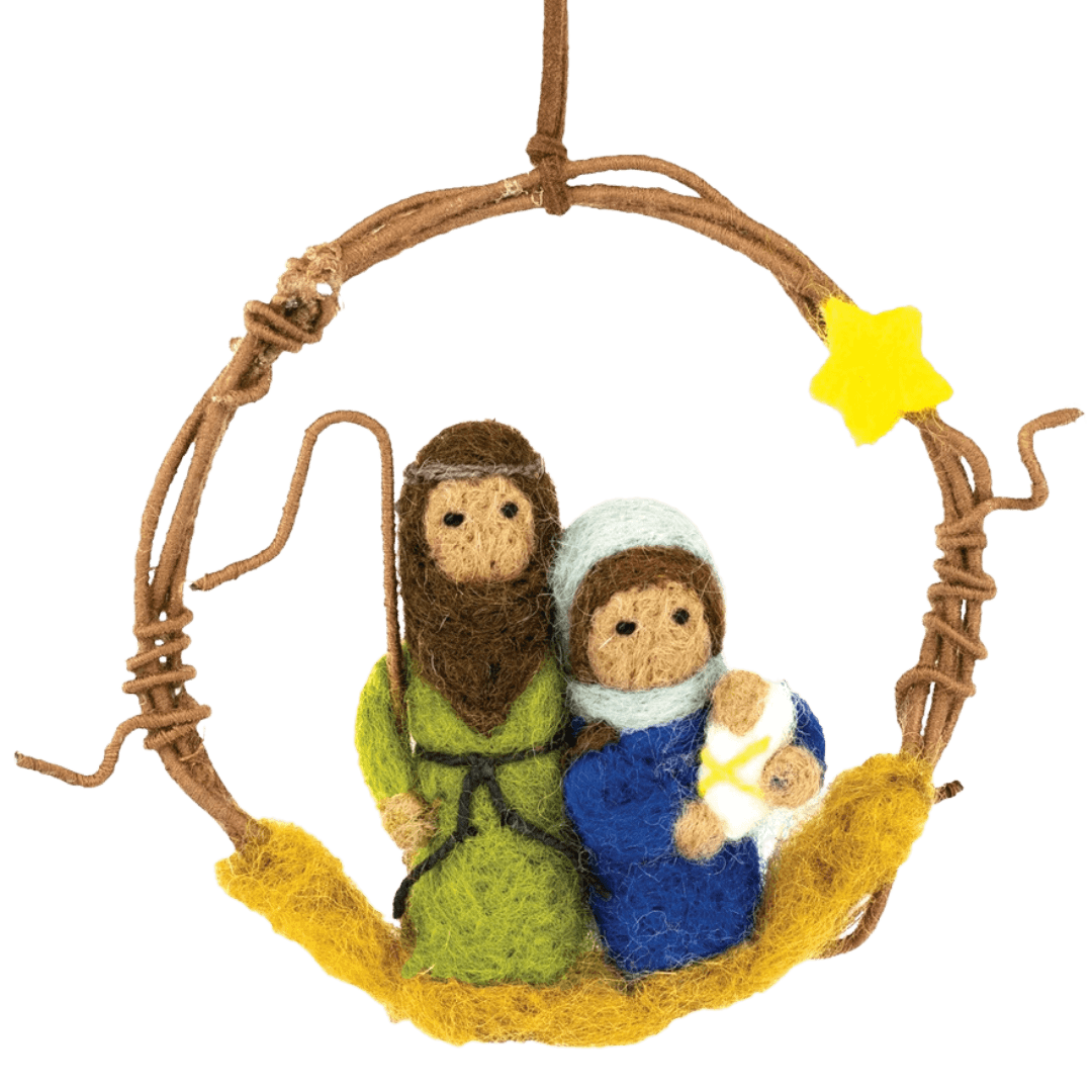 Celebrate the story of the holy night with this charming, hand-felted nativity ornament. Featuring expressive details that capture the essence of the nativity scene, this miniature wreath is crafted in a honey suckle style. Versatile in its use, it can adorn your Christmas tree, or be displayed as wall or window décor.