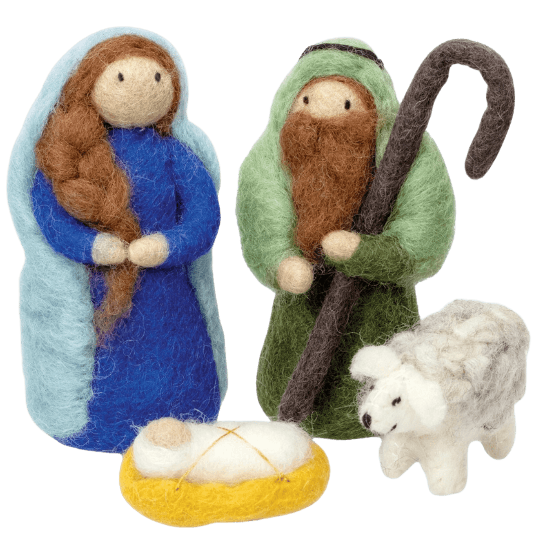 This charming, ornament-sized nativity set is perfect for both home decorating and children's play. Lovingly handmade by skilled artisans in Nepal, it features 100% natural wool and non-toxic dyes. To create a complete creche scene, pair this set with our 'Three Kings Nativity' and 'Caravan Camel' ornament. Each piece includes a festive 'Fair Trade Holiday' gift tag with a To/From panel inside, making it an ideal gift.