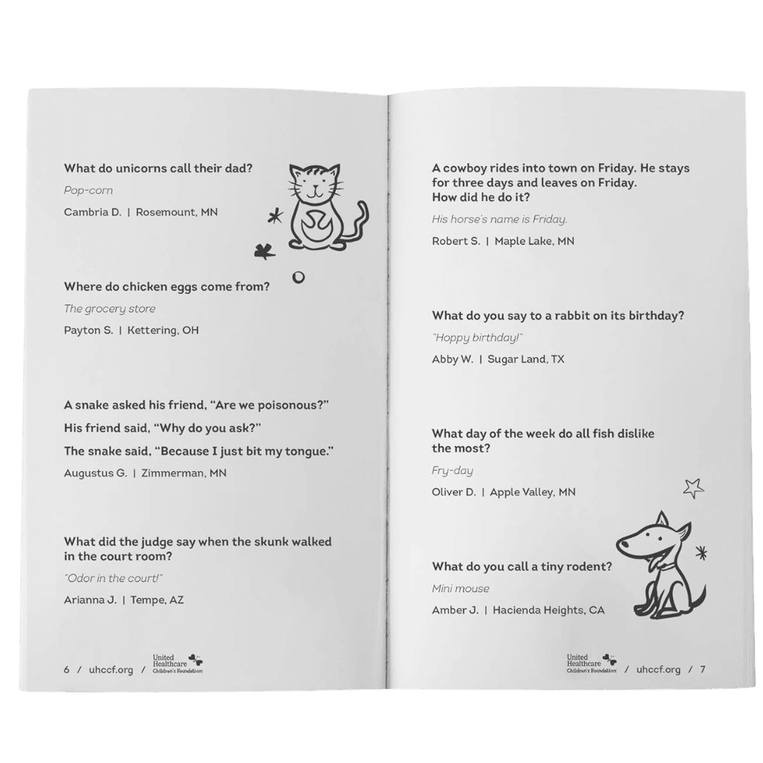 Dive into laughter with the Simply Silly Animal Jokes Joke Book, packed with over 700 hilarious animal jokes submitted by kids, for kids! Whether you're 5 or 95, this book is sure to bring joy to your day. Plus, every purchase supports the UnitedHealthcare Children's Foundation (UHCCF), providing medical grants to children and their families.