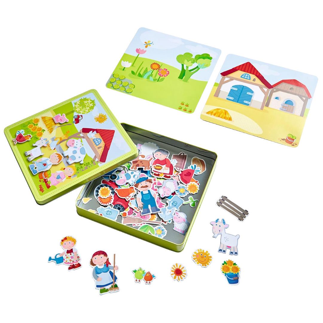 - Contains 1 magnetic tin, 4 background scenes and 122 magnetic pieces. Magnetic tin measures 8.5" x 8.5". Suitable for ages 3+