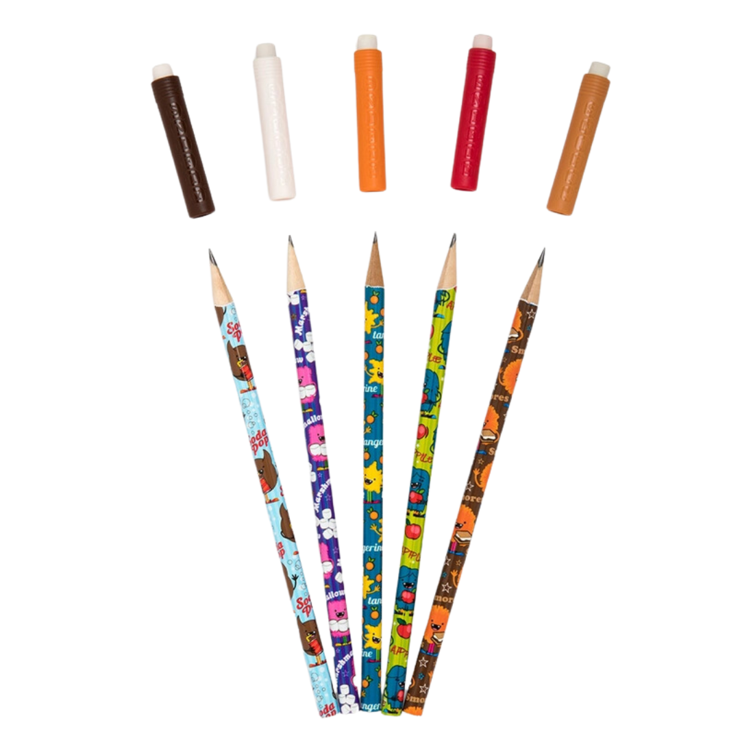 Cute Monster Pencils with Reusable Sweet-Scented Caps! Add a fun twist to your writing with our adorable Munchy Monsters Pencil Topper - 5 pack, each topped with a reusable sweet-scented cap. This set features five irresistible scents: