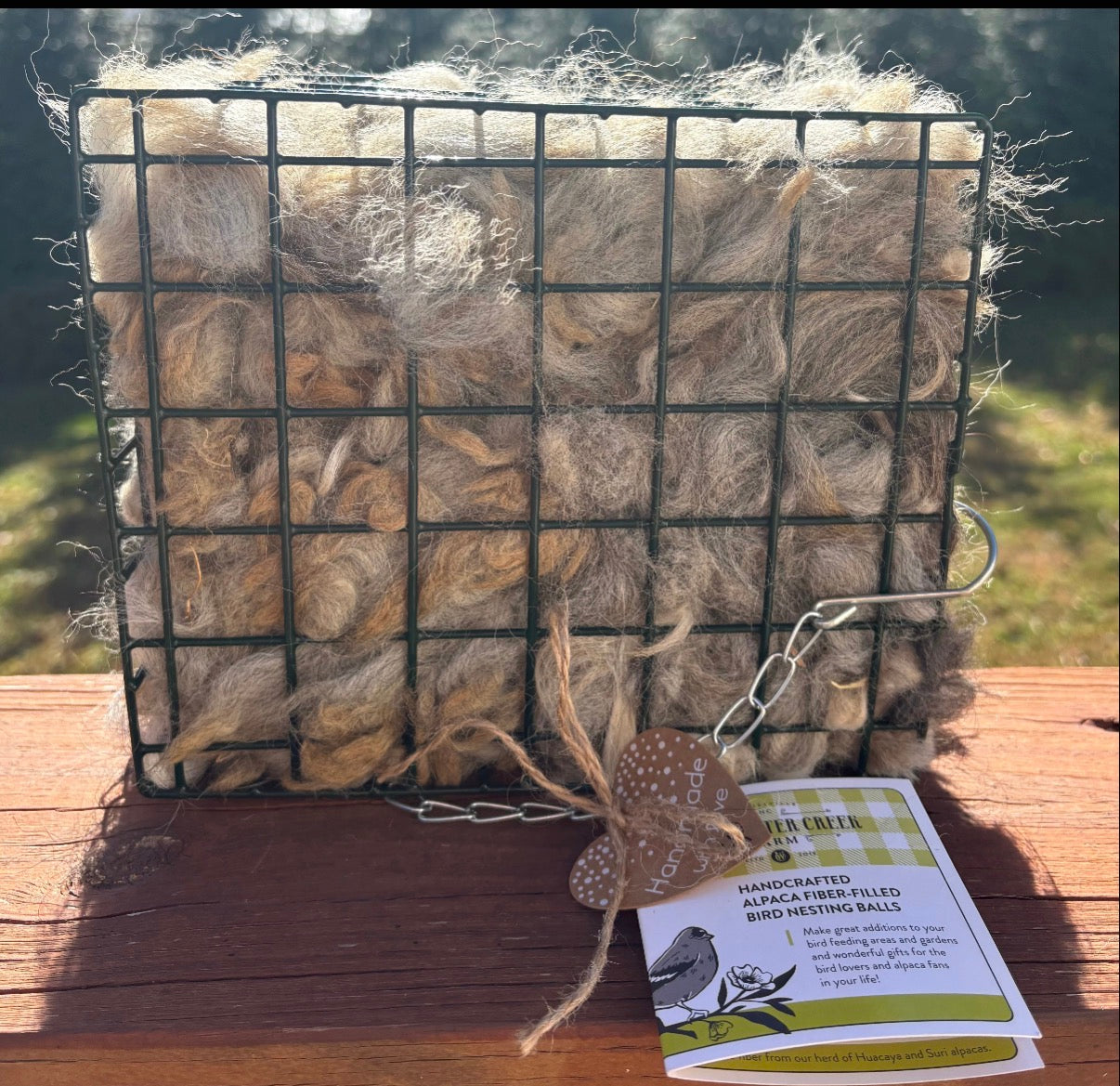 These nesting balls will attract all kinds of birds to build nests in your yard. Our own alpaca fiber and sheep's wool offers a sustainable, hypoallergenic, resource for them to work with. They will pick what they need and build nests nearby. When they have used all the fiber, refill with our fiber/wool packs or with bird seed for them to share with their babies.