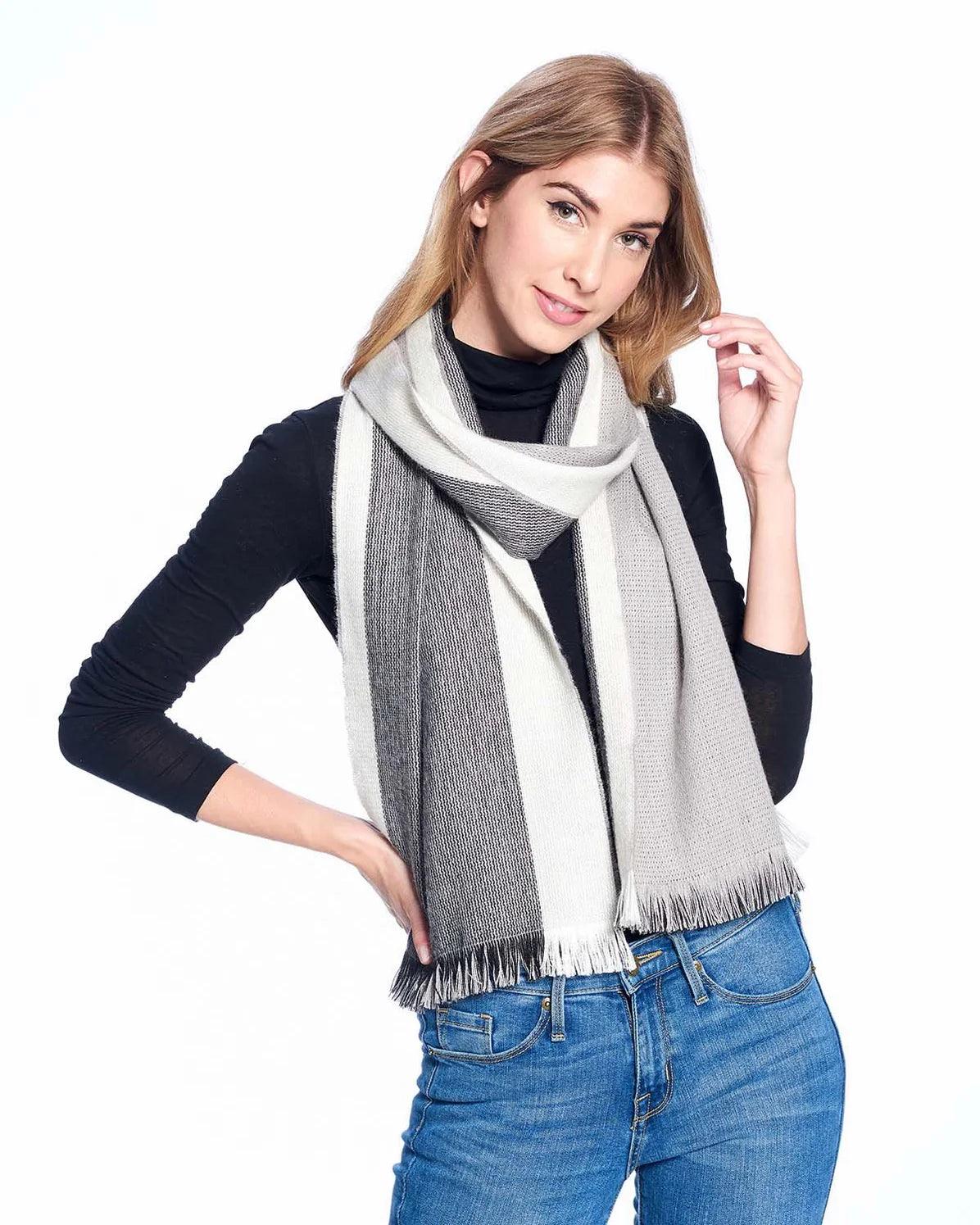 This scarf is unique for its natural crimp, durability, and elasticity. Not only is it soft and hypoallergenic, it is also durable for many years of use. With neutral colors and a chic design, this scarf is a perfect addition to any closet.