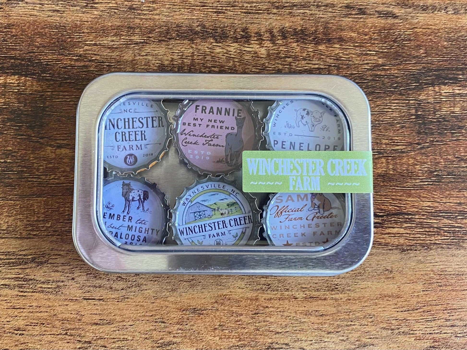 Take our family wherever you go with these adorable bottle cap magnets! Our six-pack of themed magnets is made in the USA from recycled bottle caps. Our travel-sized pack can make fabulous and unique gifts and be used in the kitchen, office, or on any magnetic surface!