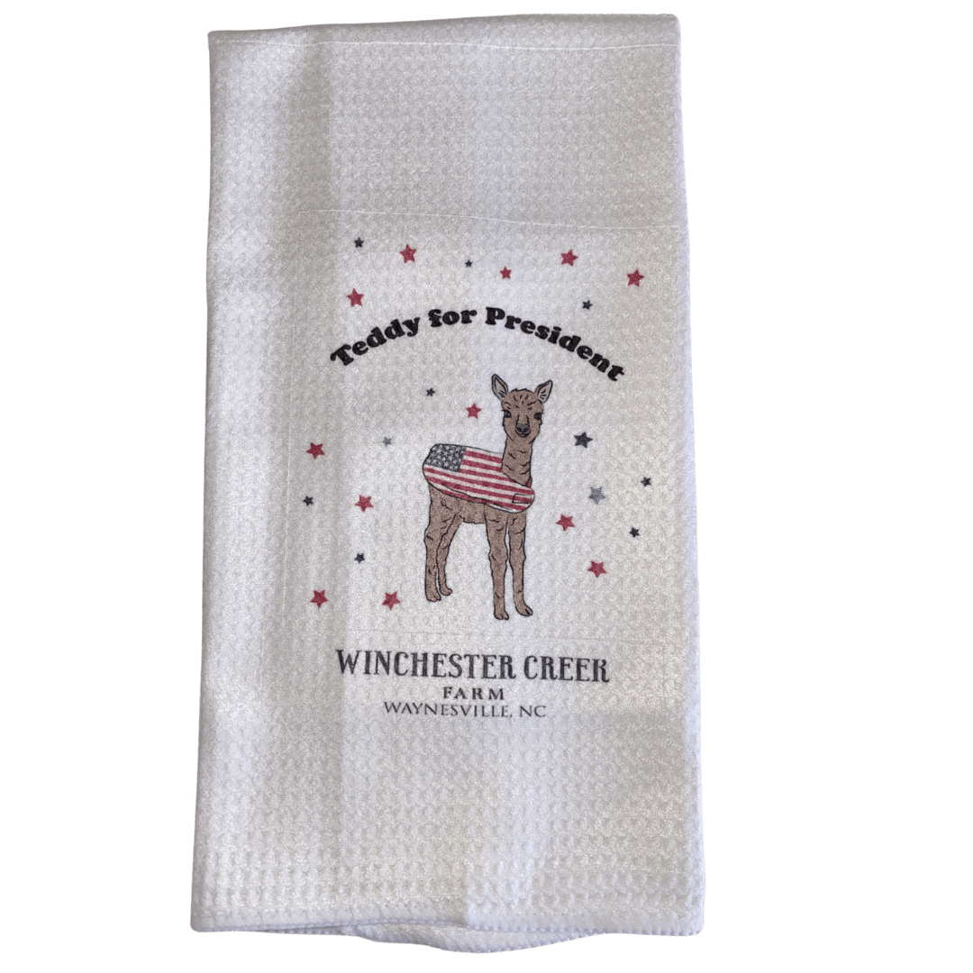 Bring the Teddy's campaign home with you with this branded Winchester Creek Farm dishtowel. This adorable handmade dishtowel features an adorable illustration of one of our most popular alpacas on the farm. Don't hesitate to add this to your home decor!